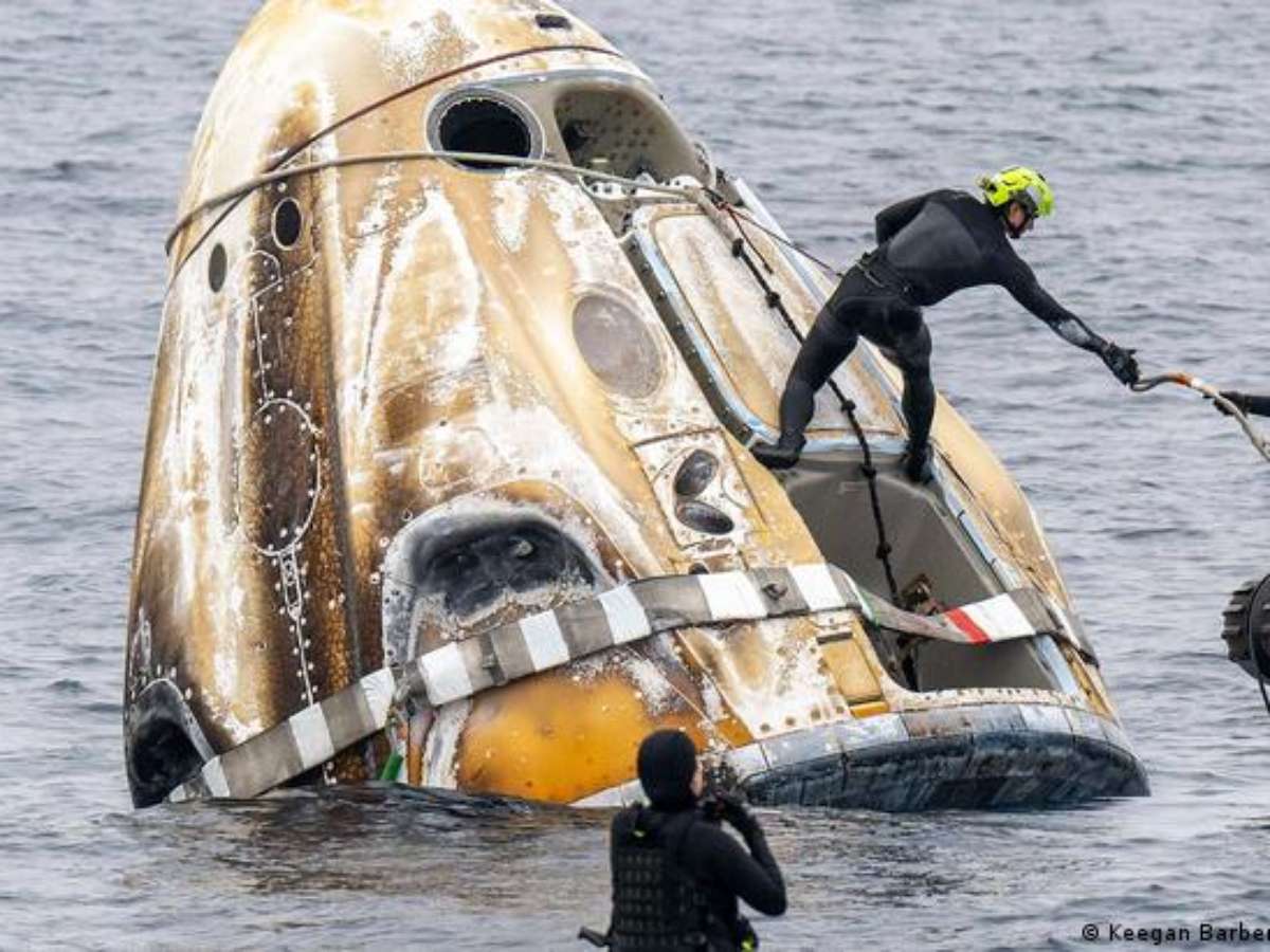 Uma transmissão de vídeo da Nasa mostrou a cápsula que transportava os astronautas americanos Mike Fincke e Zena Cardman, o cosmonauta russo Oleg Platonov e o astronauta japonês Kimiya Yui pousando na costa da Califórnia, perto de San Diego, no início da manhã (horário de Brasília).