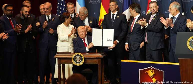"Neste dia histórico, nos reunimos para anunciar uma nova coalizão militar para erradicar os cartéis criminosos que assolam nossa região", disse Trump. "O cerne do nosso acordo é o compromisso de usar força militar letal para destruir os cartéis sinistros e as redes terroristas. De uma vez por todas, vamos nos livrar deles", acrescentou o presidente.