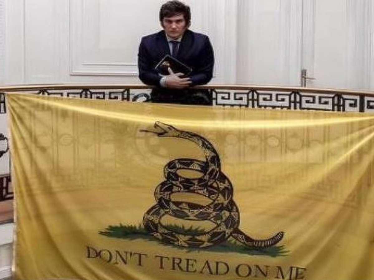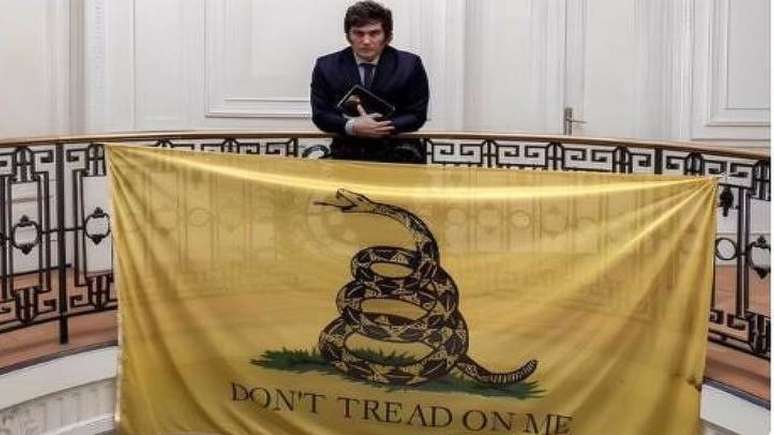 Na foto compartilhada por Trump, Milei aparece atrás de uma bandeira amarela com a ilustração de uma cobra cascavel e a frase "don't tread on me", ou "não pise em mim", em português.