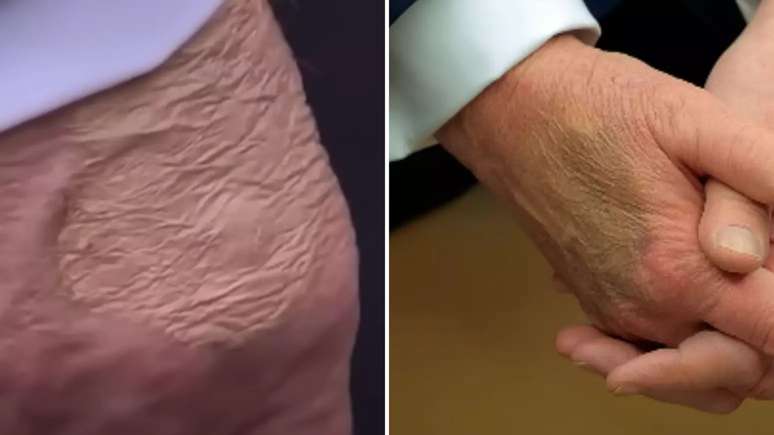 Não foi a primeira vez que a aparência da mão gerou atenção. Em fevereiro, Trump apareceu com a região arroxeada. Em maio, às vésperas de uma viagem ao Catar, a coloração estava amarelada, sinal de maquiagem para disfarçar hematomas. Situações semelhantes voltaram a ser registradas em compromissos internacionais, como na cúpula da Otan, em junho, e em recentes aparições públicas.