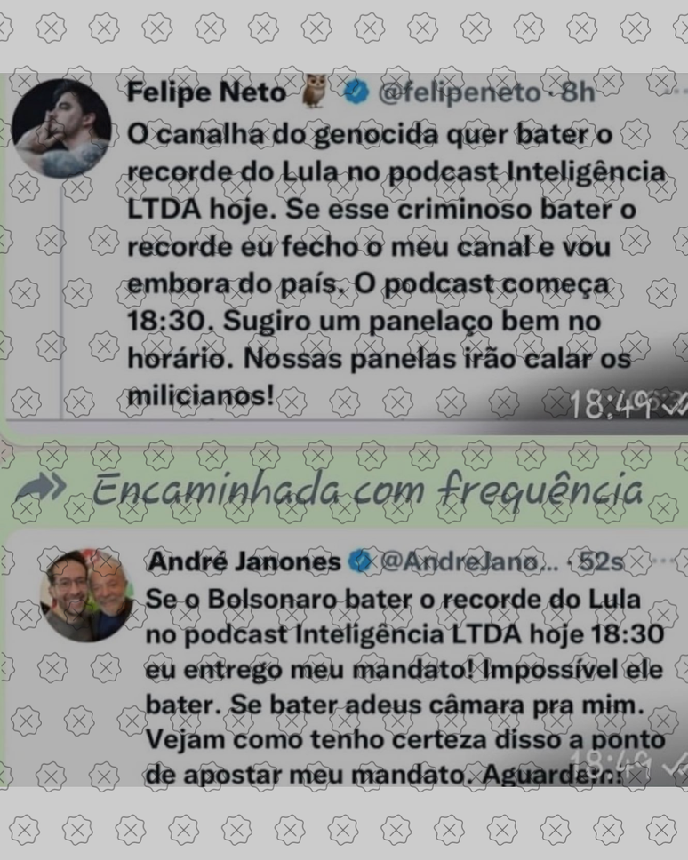 Não são reais os tuítes em que Felipe Neto afirma que sairia do Brasil e em que André Janones (Avante-MG) diz que renunciaria ao mandato caso a entrevista de Bolsonaro ao podcast Inteligência Limitada batesse o recorde de ouvintes da de Lula ao Flow Podcast. Além de o influenciador digital e o deputado terem desmentido a autoria das mensagens que circulam nas redes sociais, Aos Fatos não encontrou indícios de que esses tuítes foram de fato veiculados.