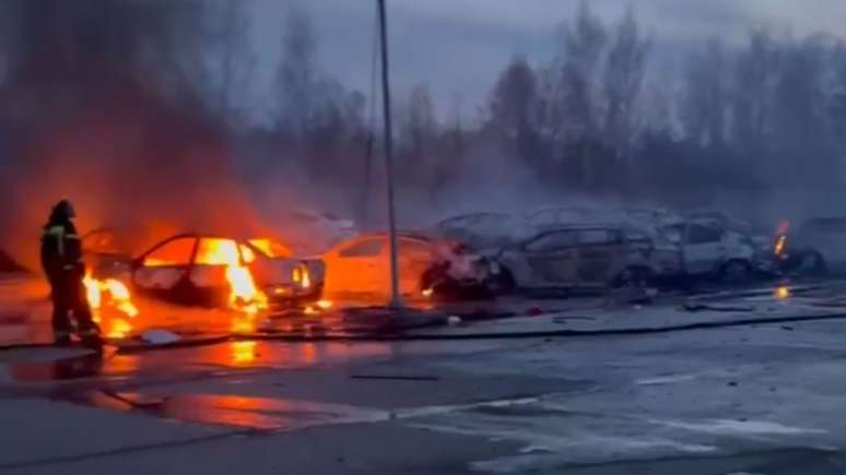 Equipes de emergência trabalham nos locais atingidos. Imagens divulgadas por veículos de comunicação russos mostram prédios com vidraças destruídas e telhados perfurados pelos impactos.