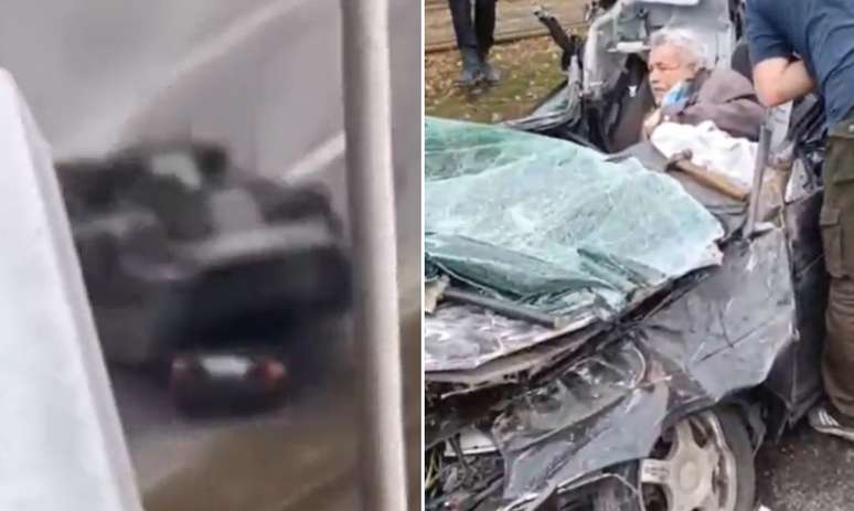 A imagem sequente é ainda mais impressionante. O condutor um veículo, um homem de idade, aparece vivo e sem ferimentos aparentes dentro das ferragens do carro, enquanto pessoas o ajudam a tirá-lo de lá.
