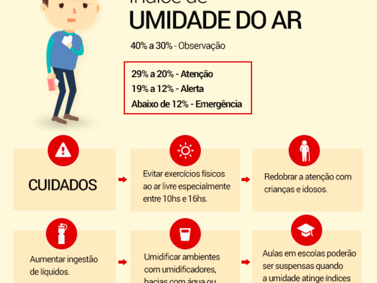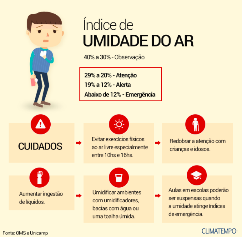 O ar seco é preocupante, já que durante o outono/inverno, é comum a umidade relativa do ar nas grandes cidades cair até abaixo dos 30%. O ideal, de acordo com a OMS - Organização Mundial de Saúde, é que ocorra uma variação entre 50 e 80%. É por isso que, quando os níveis estão entre 20 e 30%, as regiões entram em estado de atenção.