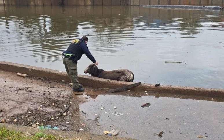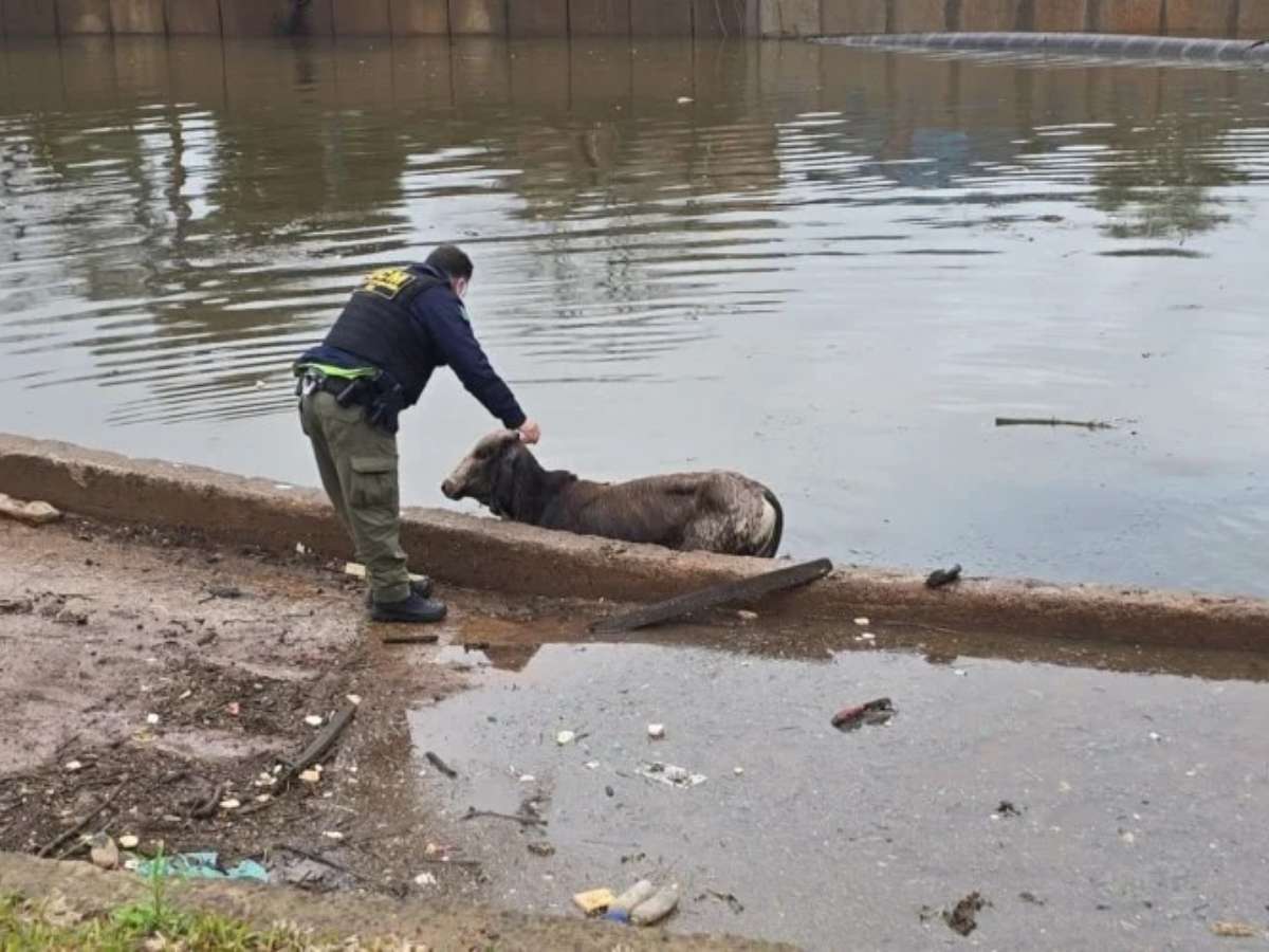 Uma vaca foi resgatada de dentro do Arroio João Corrêa, no bairro Vicentina, em São Leopoldo, na manhã deste domingo (29). O animal foi avistado por equipes da Guarda Civil Municipal (GCM) e da Defesa Civil durante uma vistoria de rotina feita para monitorar os impactos das chuvas na cidade. A vaca estava próxima à casa de bombas do bairro, ponto estratégico de observação em dias de instabilidade climática.