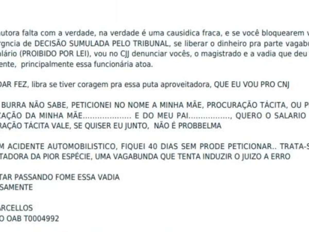 Irritado com a decisão, o advogado resolveu contatar o juiz e expressar seu descontentamento, acusando a outra parte de ser "uma vagabunda que tenta induzir o juizo (sic) a erro", além de justificar que, por sofrer um acidente de carro, não pôde, por um tempo, exercer a profissão.