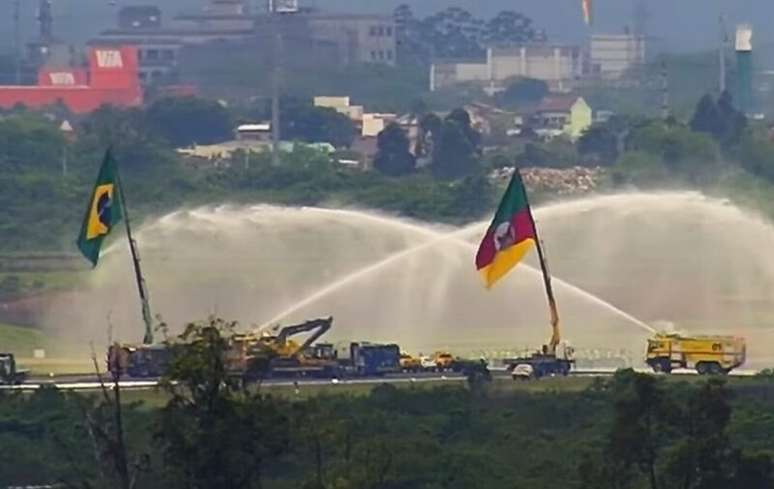 Vídeo: Aeroporto de Porto Alegre celebra conclusão de obras com "arco de batismo" e bandeira gigante do RS