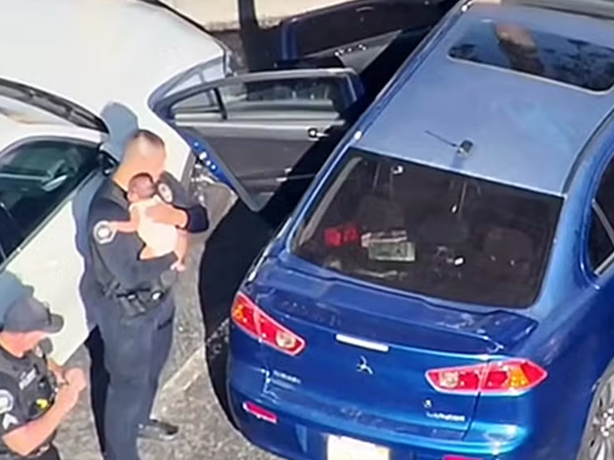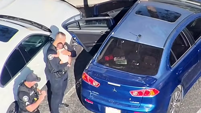 A situação se agravava pelo calor extremo. O Corpo de Bombeiros da cidade foi acionado e aferiu a temperatura interna do carro, que chegava a 43°C — um risco gravíssimo para a vida da criança. As câmeras corporais dos policiais e imagens aéreas mostram um dos agentes quebrando o vidro da porta do motorista, retirando os estilhaços com cuidado e abrindo a porta para que o colega pudesse alcançar o bebê no banco traseiro.