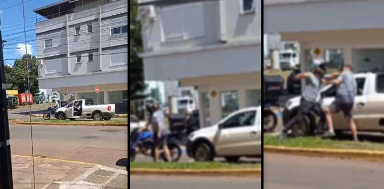 Após uma discussão, o condutor da Saveiro desembarca do veículo e parte para cima do motociclista, resultando em uma briga física entre ambos. O motociclista revida, desferindo socos contra o homem, que após o confronto, retorna ao veículo e deixa o local.