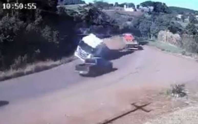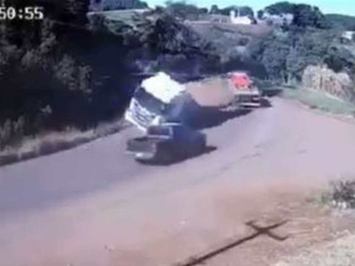 Um caminhão que transportava leite tombou na manhã desta quinta-feira (3), na RS-129, entre os municípios de Vanini e David Canabarro, no Norte do Rio Grande do Sul. Câmeras de segurança registraram o momento em que o veículo perdeu o controle em uma curva e colidiu com dois carros que trafegavam no sentido oposto.