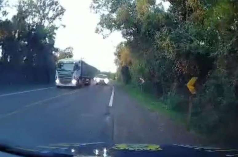 VÍDEO: Caminhonete ultrapassa em curva e quase colide frontalmente contra viatura no RS