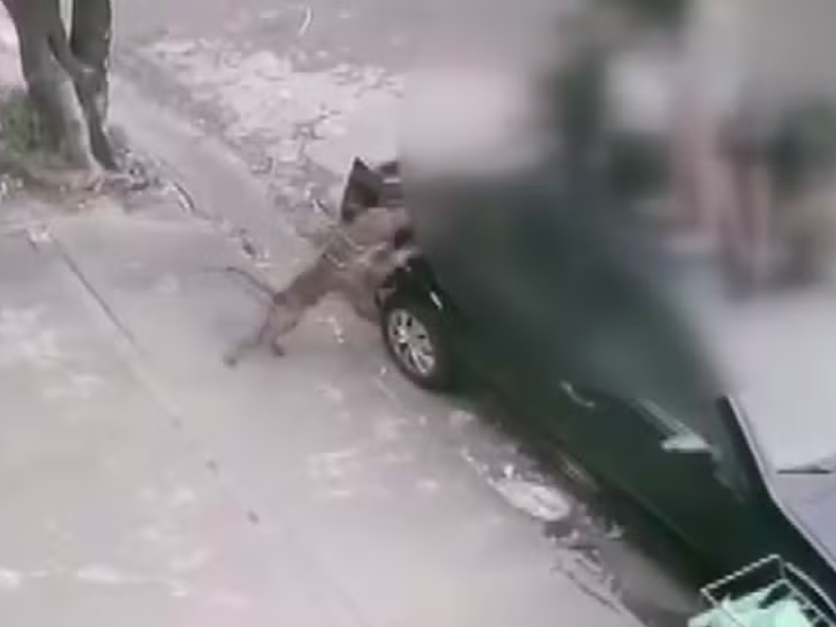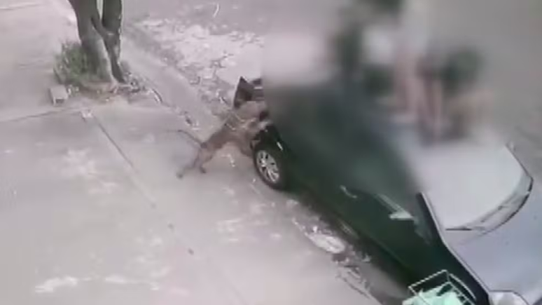 O episódio foi registrado por uma câmera de segurança e revela o desespero das vítimas. As imagens mostram o cão, que teria fugido de uma residência próxima, perseguindo as pessoas na rua. O animal tenta subir no carro e, em determinado momento, consegue alcançar o capô, o que força as vítimas a descerem rapidamente e correrem para dentro das casas vizinhas. O teto do automóvel, usado como abrigo improvisado, ficou visivelmente danificado após a fuga em massa.