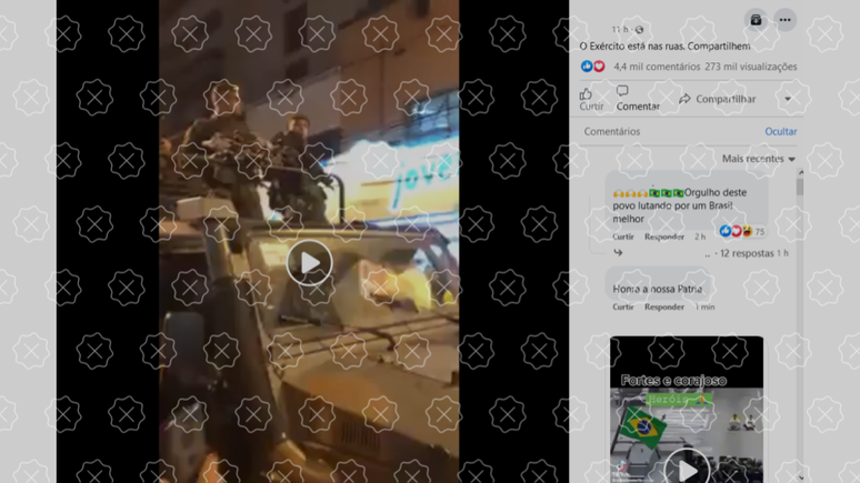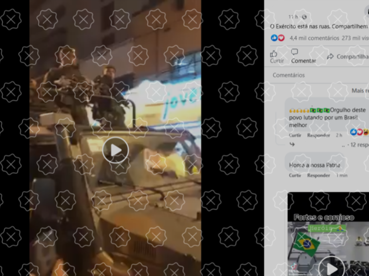 Um vídeo gravado em outubro de 2018 vem circulando nas redes sociais como se mostrasse veículos militares que estariam nas ruas brasileiras em adesão aos movimentos golpistas contra o resultado da eleição de 2022. A gravação original foi publicada pelo G1 em outubro daquele ano e mostra tropas do Exército na avenida Jornalista Alberto Francisco Torres, em Niterói (RJ).