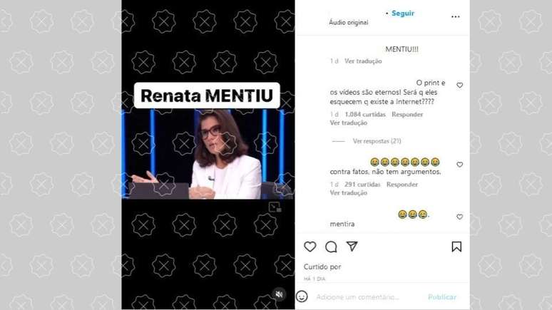 No fim da peça desinformativa, o autor mostra um vídeo publicado no dia 29 de março de 2020 pelo apresentador Serginho Groisman, em que diversos artistas pedem para que as pessoas fiquem em casa. Sobre as imagens, aparece a legenda "Renata mentiu".