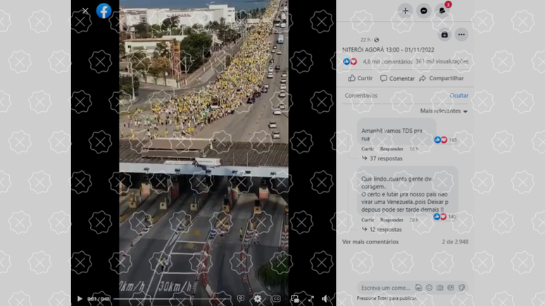 Um vídeo gravado em setembro de 2018 na Terceira Ponte, que separa as cidades de Vitória e Vila Velha (ES), tem sido compartilhado nas redes como se registrasse uma das atuais manifestações golpistas contra a derrota do presidente Jair Bolsonaro em Niterói (RJ). As imagens foram registradas em ato pró-Bolsonaro no dia 30 de setembro daquele ano, pouco antes do primeiro turno das eleições, que aconteceu em 7 de outubro.