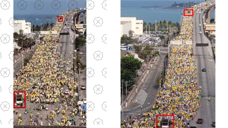 Comparação. Posição idêntica de carros de som no frame do vídeo (esquerda) e na imagem (direita) apontam que gravação foi feita em 2018