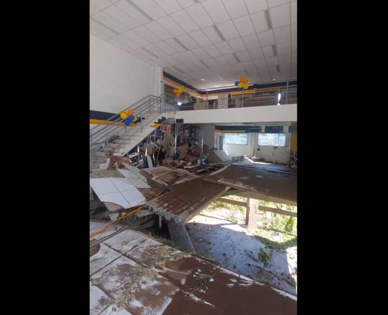 As imagens revelam um cenário desolador, no qual nem mesmo o piso foi poupado pela intensidade da inundação. Uma parede do prédio foi arrancada, deixando a loja completamente vazia. Surpreendentemente, alguns móveis permaneceram secos, pois estavam localizados em um mezanino da loja. No entanto, devido à condenação da estrutura do prédio e ao risco iminente, os poucos produtos que sobraram não puderam ser retirados do local.