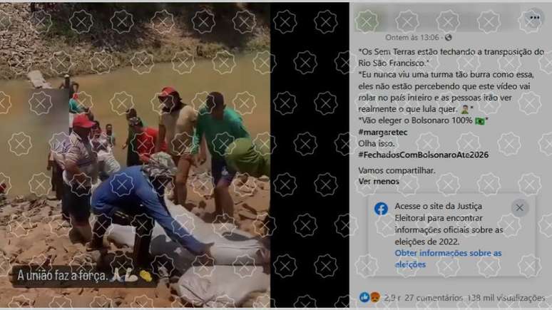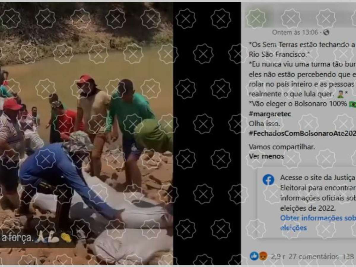 Os homens que colocam sacos de areia no leito de um rio em um vídeo que circula nas redes sociais não são trabalhadores do MST, e o ato não é uma tentativa de bloquear um canal de transposição do rio São Francisco, como afirmam postagens. As cenas mostram uma ação de limpeza feita na última quinta-feira (20), em Santa Maria da Boa Vista (PE), por produtores do Projeto de Irrigação Fulgêncio. O objetivo é melhorar a capacidade de captação e abastecimento de água no local. Segundo o MDR, não há bloqueio em qualquer trecho da transposição neste momento.
