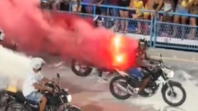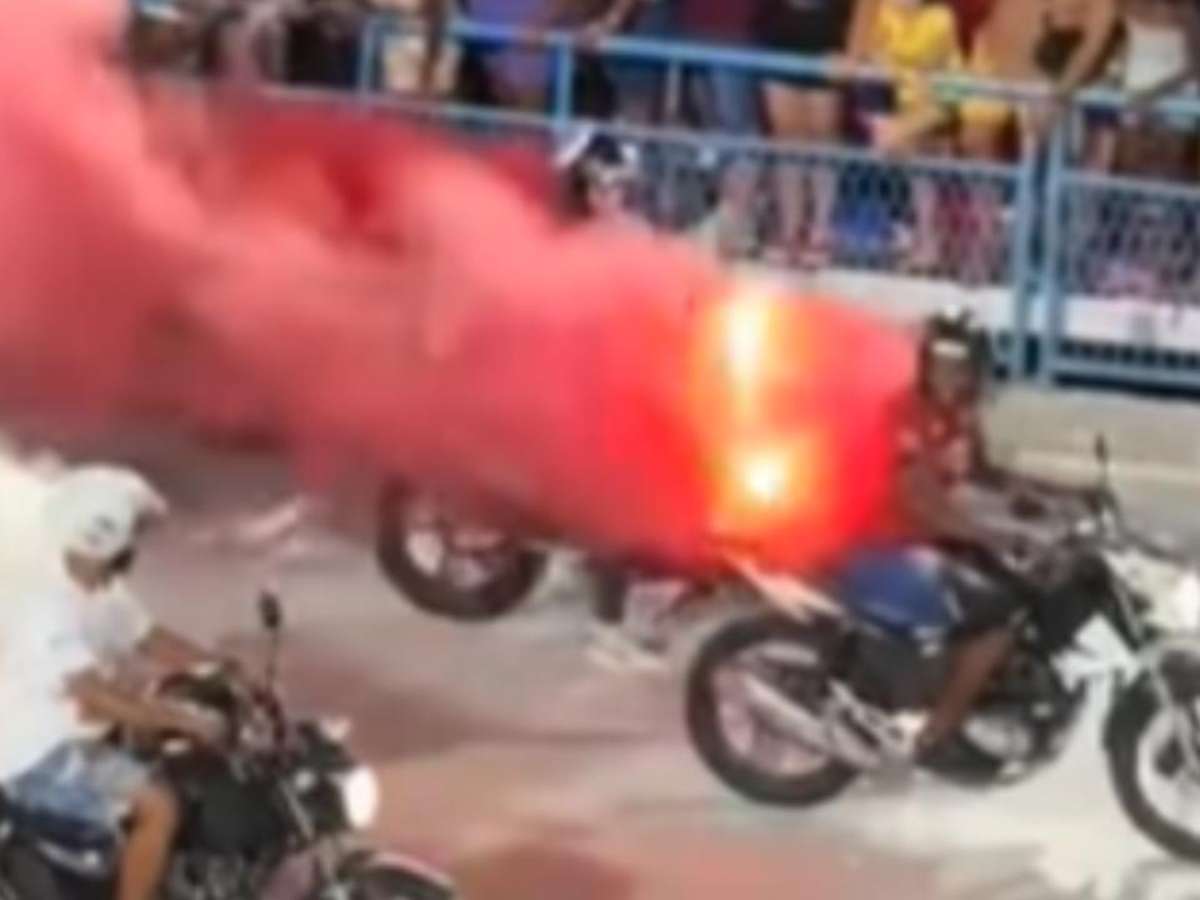 Moto pega fogo durante ensaio da Grande Rio na Sapucaí; motociclista age rápido e controla incidente, evitando danos maiores