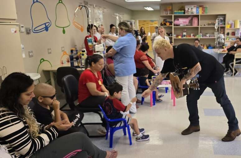 Ele traz esperança em cada acorde, seja ele acústico ou valvulado! Na manhã desta quarta-feira (16), o cantor Rafael Malenotti, e João Miguel Sampaio, somaram-se ao pediatra Tiago Dalcin, para um show muito especial para pacientes, familiares e profissionais da Oncologia Pediátrica. Ao longo de uma hora, os artistas interagiram e alegraram as crianças com canções como Até a Hora de Parar, Amigo Punk, Como é Grande meu Amor por Você e Canção do Amigo.