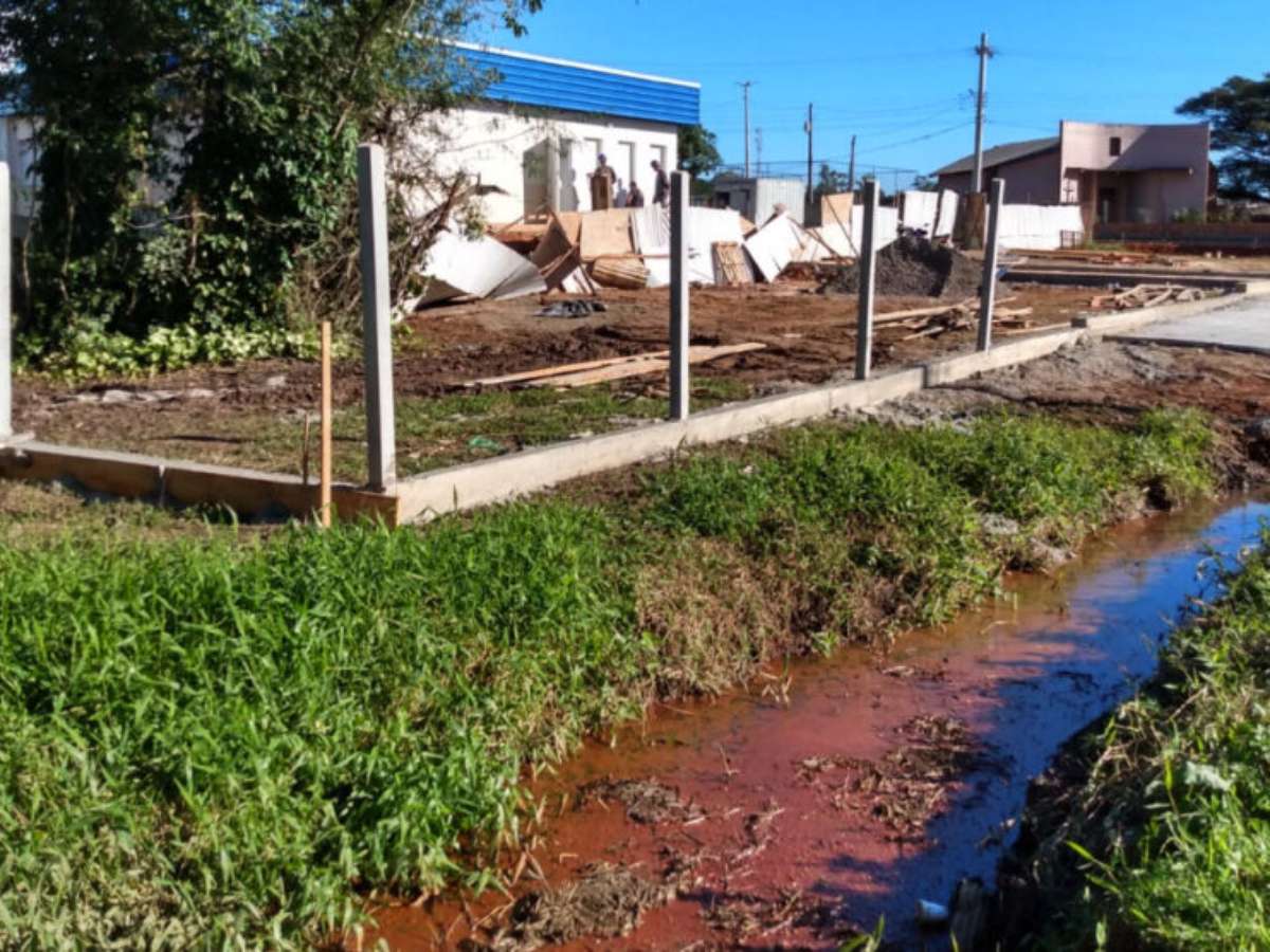 O Posto da Unidade de Saúde da Família Itatiaia, que vai ser inaugurado dia 8 de Junho em Gravataí, é rodeado por um valão com água de esgoto cloacal podre.