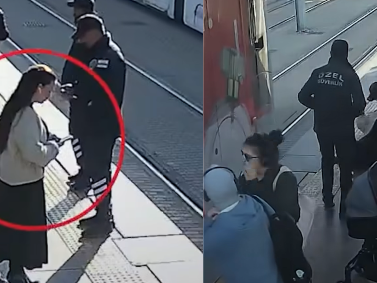 Agente de segurança em Kayseri, Turquia, salva mulher distraída e com fones de ouvido dos trilhos, puxando-a segundos antes da passagem do bonde