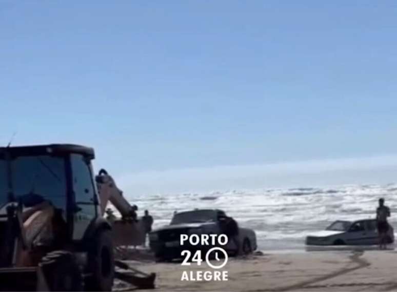 Uma cena inusitada movimentou a manhã de domingo (17) em Capão da Canoa, atraindo a atenção de moradores e banhistas. Dois veículos ficaram atolados no mar, exigindo uma operação com o uso de uma retroescavadeira para retirá-los da água.