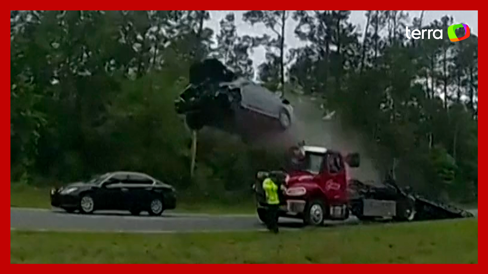 Carro 'decola' ao subir em rampa de caminhão guincho nos EUA. Caso ocorreu no Condado de Lowndes, na Geórgia, na quarta-feira, 24. A motorista do veículo aparenta não ter percebido o caminhão parado na rodovia. Ao se chocar com a rampa ela alça voo por dezenas de metros até se chocar contra o solo. A vítima, uma mulher de 21 anos, sobreviveu ao acidente, mas teve ferimentos graves.