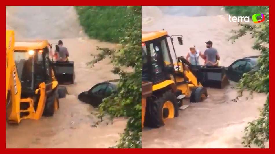 Família é resgatada por retroescavadeira após carro ficar preso em enchente em MG. A cena foi registrada nesta quarta-feira, 20, em Caeté, na região metropolitana de Belo Horizonte após fortes chuvas. Nas imagens, a família já aparece sendo retirada do local na concha do veículo; o carro onde estavam foi tomado pela água. Ninguém se feriu.