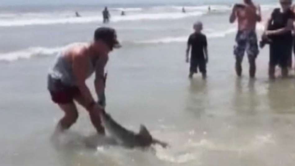 Notícias Homem arrasta tubarão pela cauda em praia da Flórida Exibir comentários Compartilhar Banhista registrou momento em que salva-vidas arrastou animal para o mar e publicou vídeo na web Reprodução Publicidade