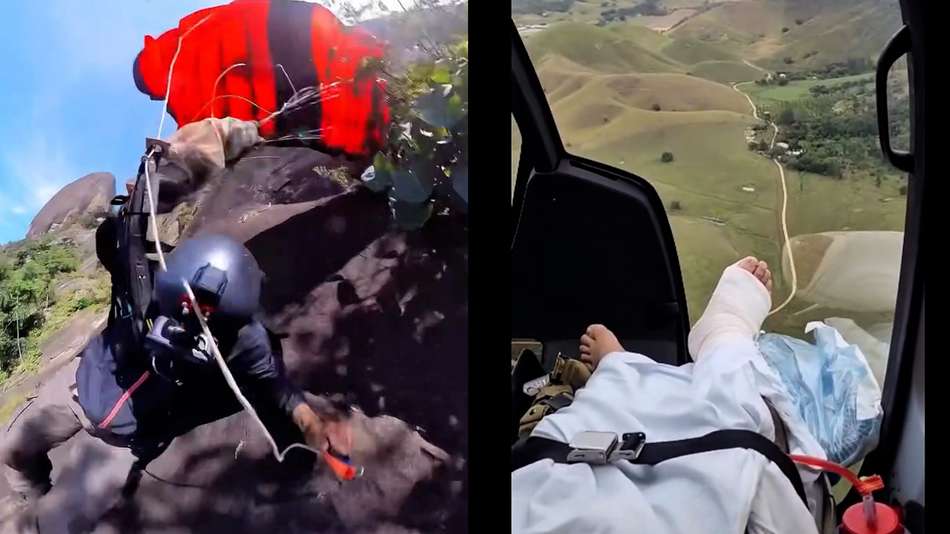 O bombeiro militar Carlos Souto registrou os momentos de tensão após saltar 850 metros na Pedra dos Cabritos, em Castelo. O acidente de base jump ocorreu em 13 de agosto, mas ele divulgou as imagens nesta terça-feira, 26. “De cama, consolidando os ossos quebrados. Foram 7 costelas, 1 tíbia, 2 fíbulas, lesões e escoriações pelo corpo, mas poderia ter sido muito pior”, escreveu. No dia do acidente, Carlos foi resgatado de helicóptero pelos bombeiros do Espírito Santo e levado para o Hospital Santa Casa de Misericórdia, em Cachoeiro de Itapemirim. O bombeiro recebeu alta no dia 23 de agosto.