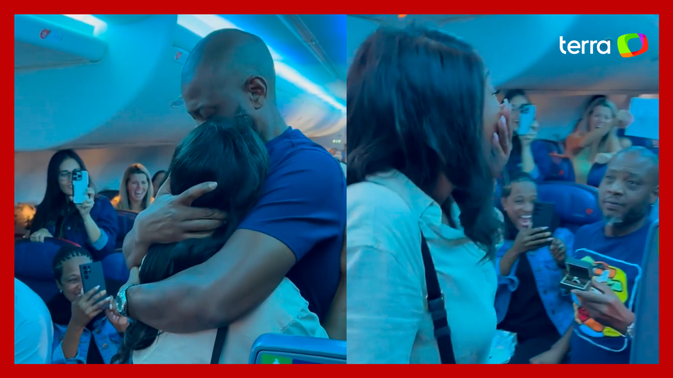 Homem pede ajuda de passageiros e faz pedido de casamento em pleno voo. Darian Brinkley aproveitou que Minita Tanne foi ao banheiro para fazer a surpresa. No vídeo, ele aguarda a companheira deixar o local de joelhos e com um anel. Passageiros participam da ação, com cartazes dizendo: "Quer se casar comigo?". Ao se deparar com o pedido, Minita parece não acreditar no que vê. Darian não precisa dizer nada enquanto a sua amada observa a cena. Ela tenta conter as lágrimas e rapidamente acena com a cabeça que sim. O homem então coloca o anel no dedo da mulher e o casal se abraça. Com o desfecho positivo, os passageiros comemoram e aplaudem.