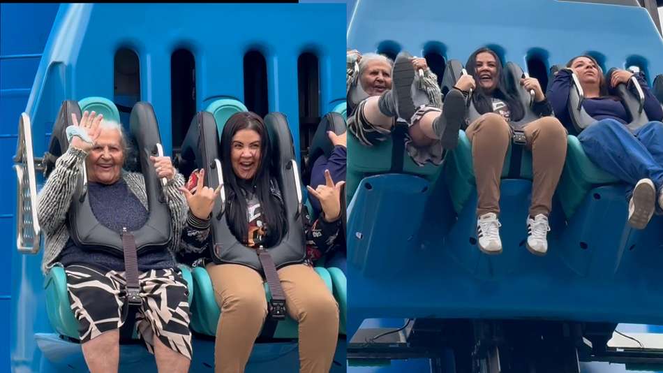 O brinquedo é do Beto Carrero World, parque de diversões localizado em Penha (SC). A cena de pura emoção e coragem viralizou nas redes sociais. Nos registros, a idosa aparece se preparando para o salto, enquanto é gravada pela neta. Reprodução/Instagram/@Sarinhaaraujooficial Reprodução/Instagram/@myhoodbr