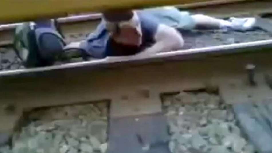 Notícias Jovem deita sobre trilhos durante passagem de trem Exibir comentários Compartilhar Rapaz é filmado arriscando a vida deitado sobre os trilhos durante a passagem de um trem cargueiro nos EUA Reprodução Publicidade
