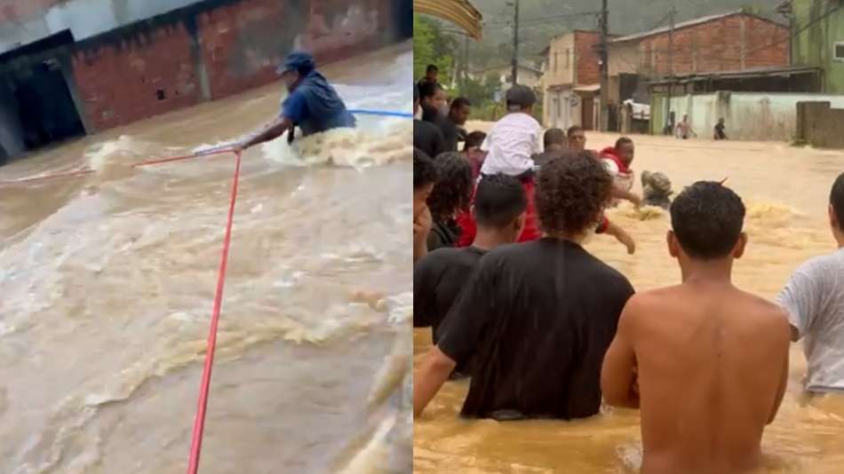 Moradores usam cordas para não serem arrastados e resgatar pessoas em enchente em Paraty (RJ). As imagens foram registradas na tarde de quinta-feira, 26, no bairro Condado, no município da Costa Verde. Há registros de alagamentos, deslizamentos e pessoas desalojadas após chover 162 milímetros nas últimas 24 horas. A Prefeitura informou que a Defesa Civil emitiu alerta para chuvas intensas com raios até esta sexta-feira, 27, e orienta que moradores evitem áreas de risco. #terravideos Reprodução/Instagram/@souza.pty/MyHood