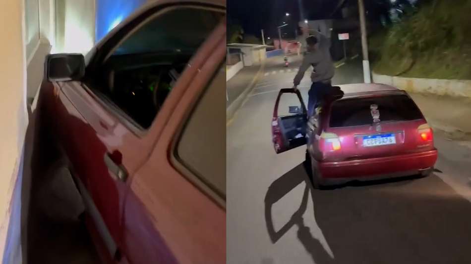 O caso aconteceu no último sábado, 30, na Avenida Fernando Costa, no bairro Parafuso, em Cajati, no interior de São Paulo. Em vídeo que circula nas redes sociais, um motorista sobe no teto do próprio carro ainda em movimento. Após cair, o veículo continuou desgovernado e bateu contra uma casa. A Polícia Civil identificou a placa do veículo e faz buscas para identificar o condutor que cometeu as infrações. Reprodução/Josyel Vieira/Facebook Reprodução/Folha Metropolitana/Facebook
