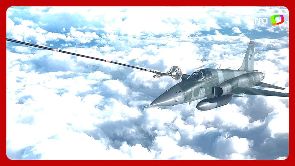 Vídeo mostra caça da FAB sendo reabastecido no ar durante operação no Brics. As imagens, divulgadas pela Força Aérea Brasileira, exibem a técnica utilizada para garantir maior autonomia às aeronaves de combate, que não precisam pousar. Na gravação, a operação é realizada entre as aeronaves KC-390 Millennium e F-5 durante a missão que restringiu parte do espaço aéreo do Rio de Janeiro. Com o procedimento, o avião-tanque e o caça são pareados e uma mangueira é lançada no ar, por onde o caça se aproxima e se conecta para receber o combustível. Imagens: Divulgação/Aeronáutica/FAB