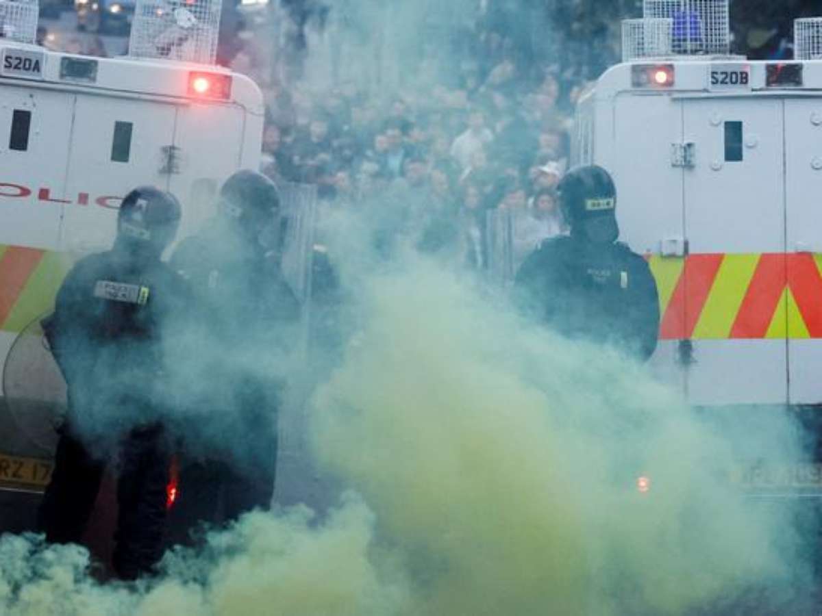 A mobilização inclui agentes enviados da Escócia. Um policial foi atingido diretamente por um coquetel molotov que caiu atrás de uma linha de veículos policiais durante um confronto prolongado com os manifestantes na sexta-feira.