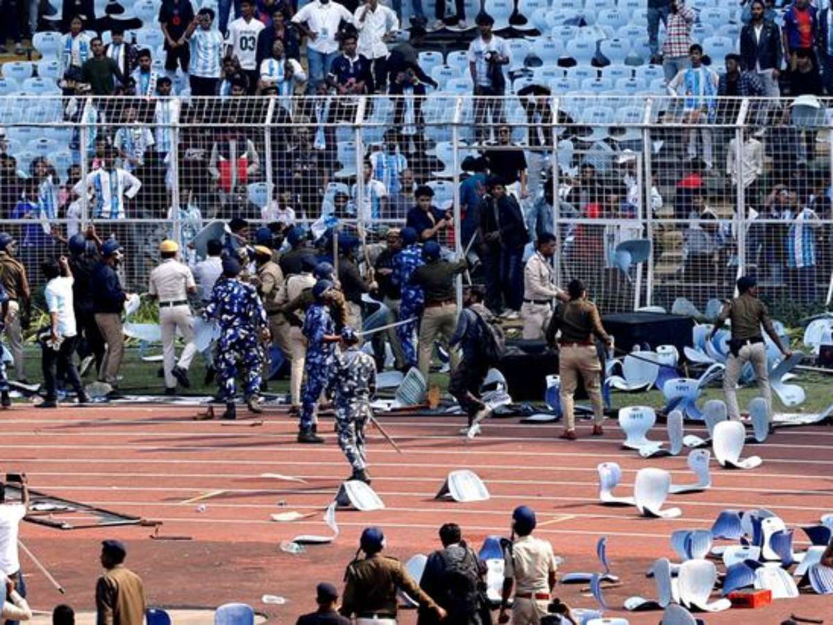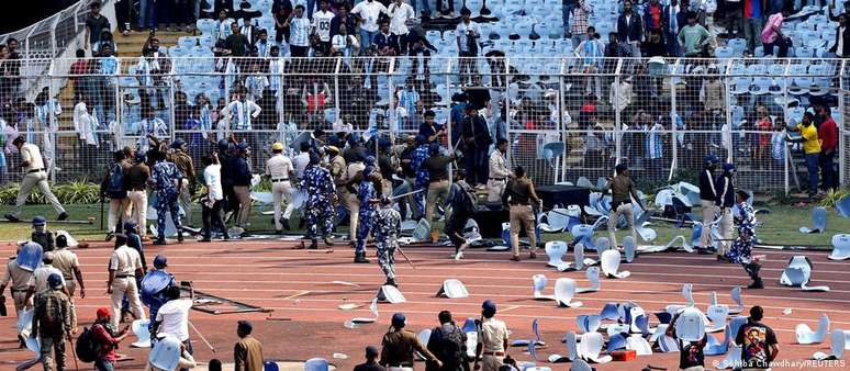 Fãs que pagaram valores altos para ver o jogador arremessaram cadeiras e invadiram o gramado após o argentino deixar o local em poucos minutos, antes do esperado.Fãs revoltados derrubaram barricadas e invadiram o gramado de um estádio na Índia neste sábado (13/12) após o jogador de futebol Lionel Messi ser retirado da arena de forma inesperada, apesar do alto preço cobrado pelos ingressos.