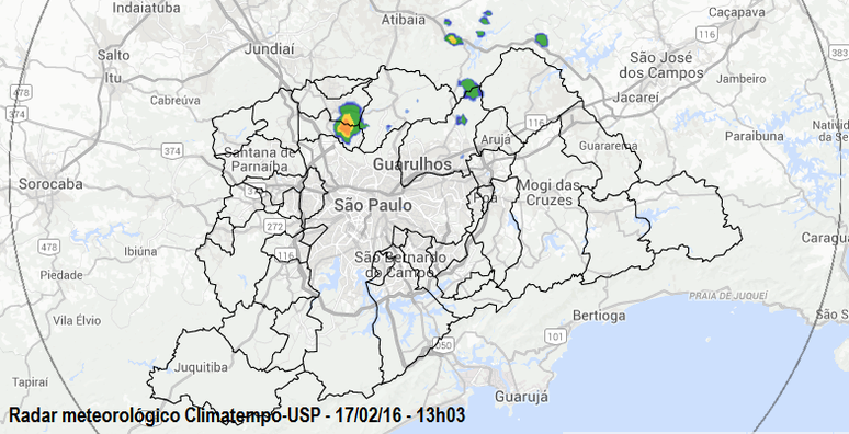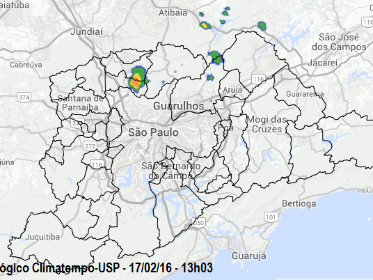 Por volta das 13 horas, os radares Climatempo-USP detectaram chuva na Grande São Paulo, na região de Caieiras, Mairiporã e Franco da Rocha. Fique atento! As áreas de chuva tendem a aumentar no decorrer da tarde e há risco de temporais até a noite na capital e Grande São Paulo.