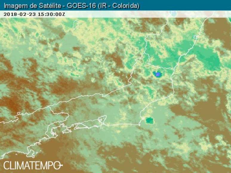 A imagem captada pelo satélite meteorológico GOES 16 às 12h30 do dia 23/2/18 mostrou o início de formação de aglomerados de nuvens carregadas perto da região dos Lagos e no Norte Fluminense. No decorrer da tarde desta sexta-feira, estas áreas de instabilidade também devem se intensificar e se espalhar mais sobre o estado do Rio de Janeiro podendo provocar fortes pancadas em várias áreas do centro e norte do estado do Rio.