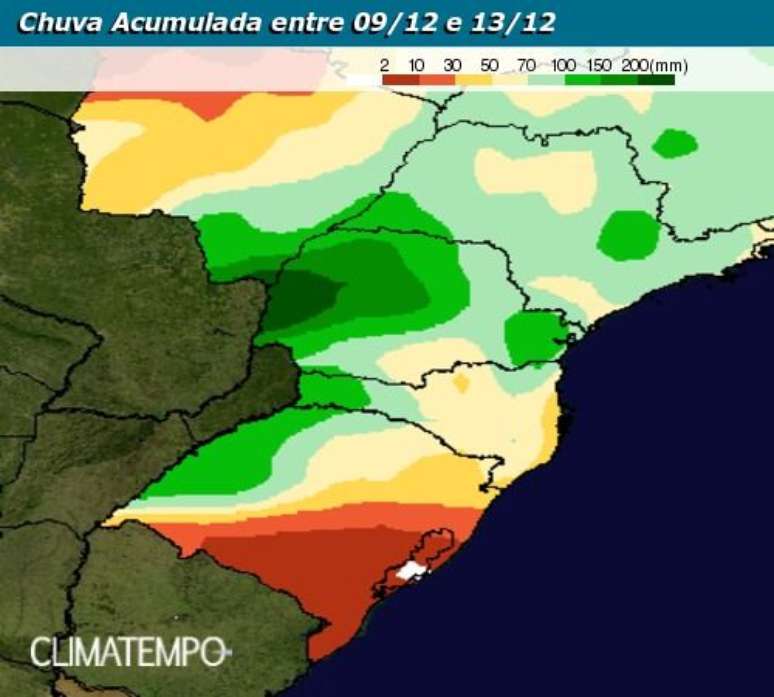 Há condições para chuva em todas as regiões do Sul do Brasil, mas o maior risco de temporais é para as áreas próximas das fronteiras com a Argentina e o Paraguai, entre o noroeste do Rio Grande do Sul e o oeste do Paraná.
