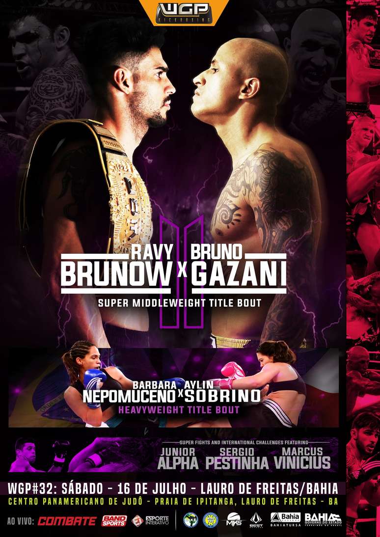 Menos de 15 dias depois de seu último evento, o WGP Kickboxing já tem mais uma edição agendada para brindar os fãs do maior evento de trocação da América Latina. No dia 16 de julho, a organização desembarca pela primeira vez na Bahia, em Salvador, para a realização do WGP #32. Dois cinturões estarão em jogo nesta noite especial: o anfitrião Ravy Brunow enfrenta o paulista Bruno Gazani em uma esperada revanche pelo título dos meio-médios (até 71,8kg), na luta principal, enquanto na co-luta a capixaba Barbara Nepomuceno e a chilena Aylin Sobrino se enfrentam para definir a primeira campeã peso-super-médio feminino (+70kg). O WGP #32 será transmitido ao vivo pelo Canal Combate, Esporte Interativo, Bandsports e TV Aratu (filial do SBT na Bahia).