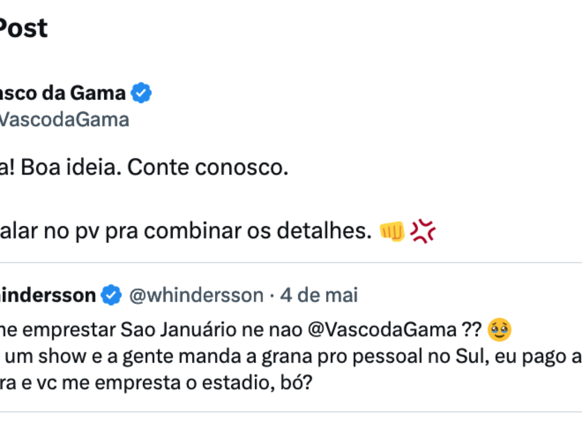 A proposta foi prontamente aceita pelo Vasco, que respondeu positivamente ao pedido do artista e indicou que as negociações para os detalhes do evento seriam tratadas em mensagem privada. O objetivo é direcionar os recursos obtidos com o espetáculo para auxiliar as vítimas das enchentes, que deixaram um rastro de destruição e um elevado número de desabrigados e feridos.