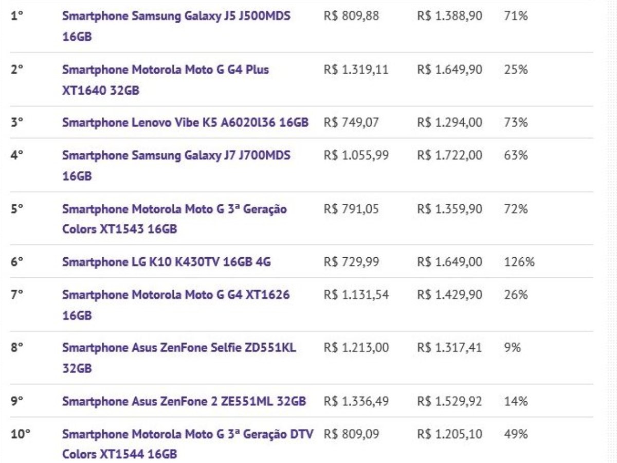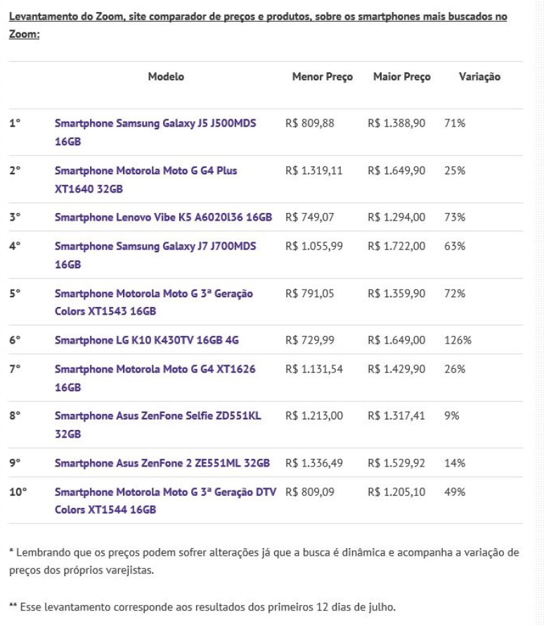 O Zoom (www.zoom.com.br), site comparador de preços e produtos, revela os smartphones mais buscados nos primeiros dias de julho. Vamos à classificação geral: o primeiro da lista continua sendo o Samsung Galaxy J5 J500MDS 16GB e o preço dele já caiu em relação ao mês anterior. Em junho, o menor preço do líder era R$ 891,91 e nesse mês passou a ser R$ 809,88. Quem escolher esse smartphone para chamar de seu precisa pesquisar bastante, pois ele varia de preço em 71% de uma loja para outra.