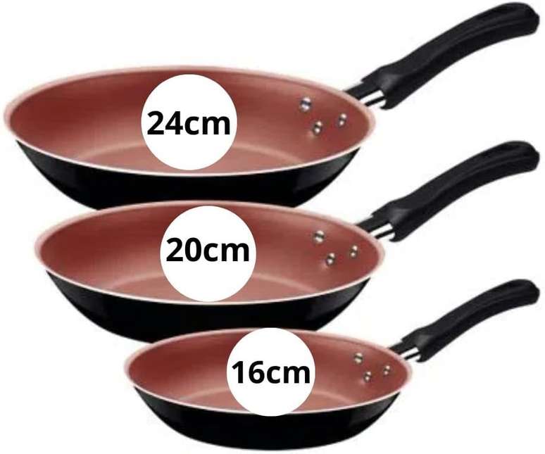 Normalmente o conjunto inclui três frigideiras: aproximadamente 16 cm, 20 cm e 24 cm de diâmetro, com capacidades variadas como 0,4 L / 0,8 L / 1,4 L conforme anúncio.