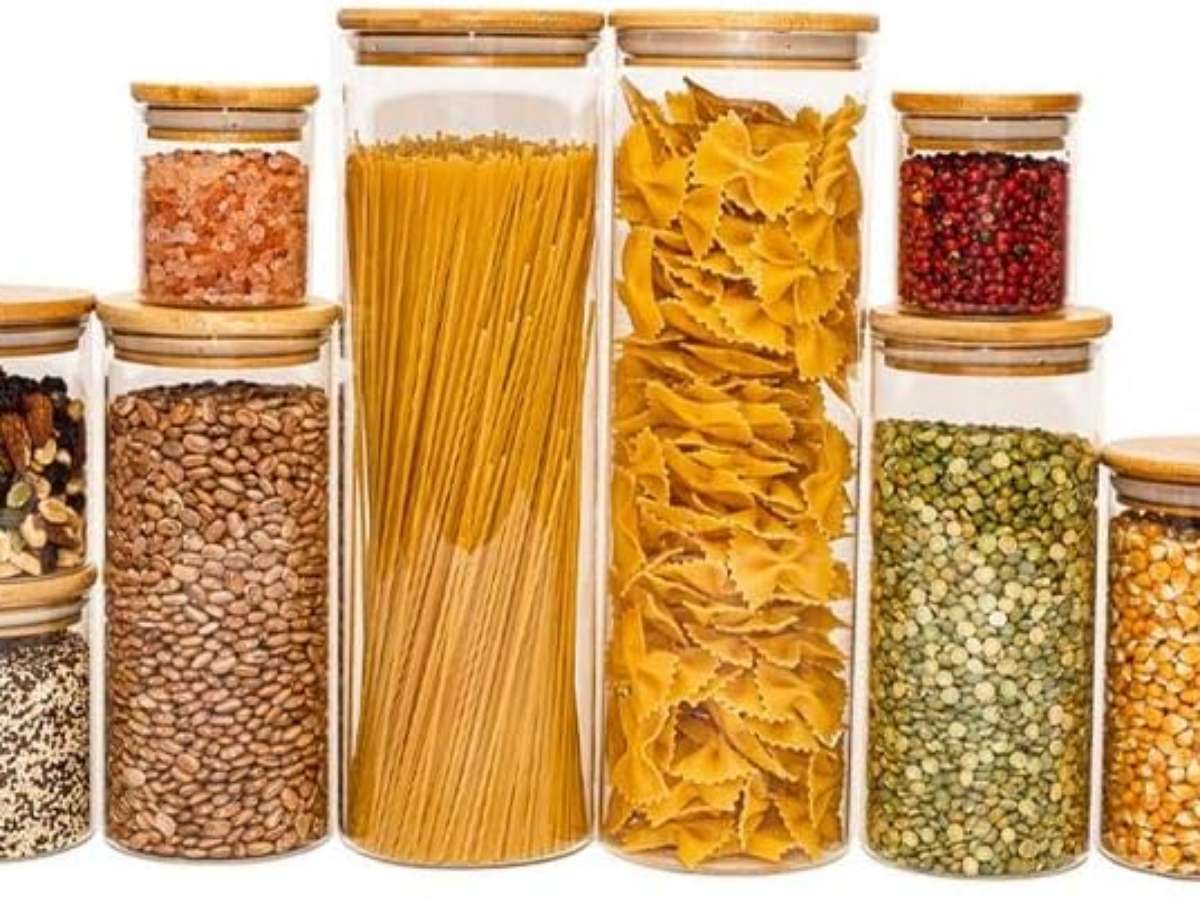 - Visual elegante – tampa de bambu + vidro transparente oferecem um visual bonito para despensa ou bancada.