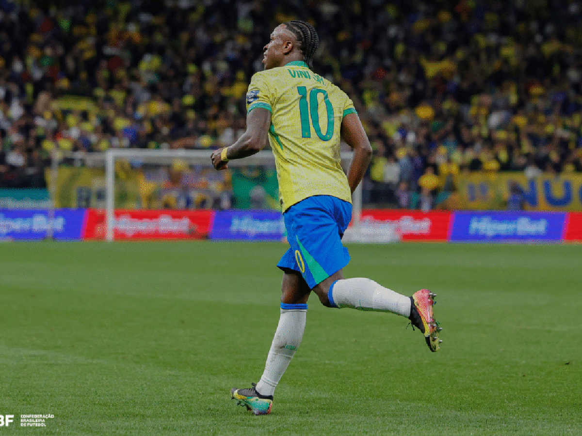 Vini Jr comemorando gol pelo Brasil; atacante é o primeiro camisa 10 de Carlo Ancelotti (Foto: @rafaelribeirorio I CBF)