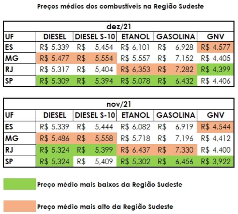 Já os postos paulistas apresentaram o menor preço médio do país para o etanol, a R$ 5,078. Entre os quatro Estados da Região, São Paulo também se destacou com as menores médias para o diesel comum e o S-10, para a gasolina e para o etanol, a R$ 5,309, R$ 5,394, R$ 5,078 e R$ 6,432 respectivamente. O etanol apresentou um recuo de 4,22% em relação a novembro.