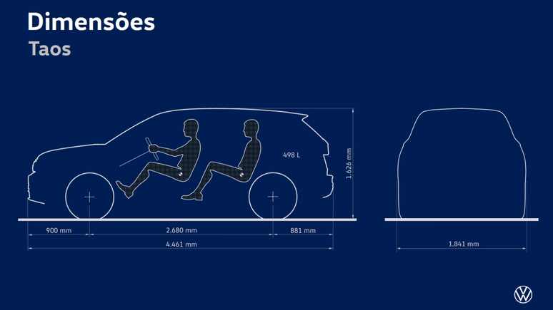 O inédito Volkswagen Taos, que será fabricado na Argentina, será maior, mais espaçoso, mais rápido, mais econômico e mais estradeiro do que o Jeep Compass. Com 4,461 m de comprimento, o Taos terá 6,7 cm a mais que o Compass, será 2,2 cm mais largo (2,680 m) e terá 4,4 cm a mais na distância entre-eixos (2,680 m). Na altura, o Taos perde por 0,7 cm, mas dá um banho no porta-malas com 88 litros a mais (498 contra 410).
